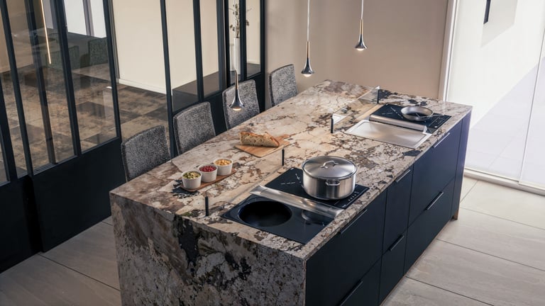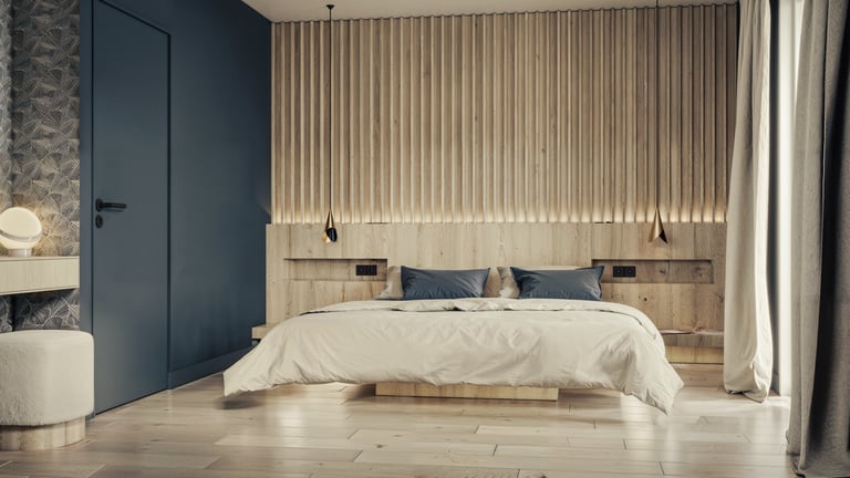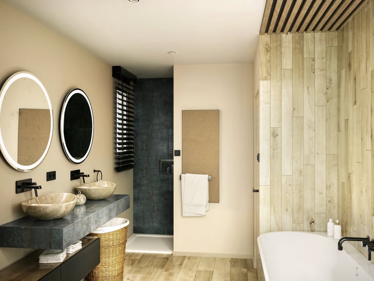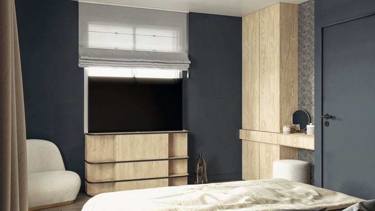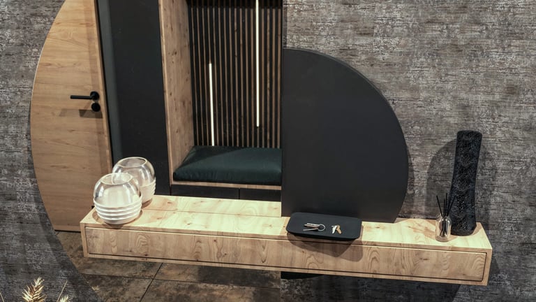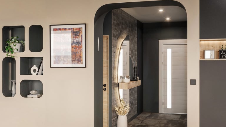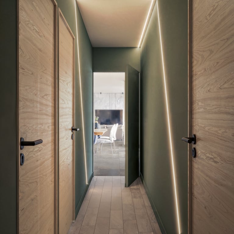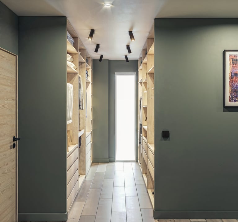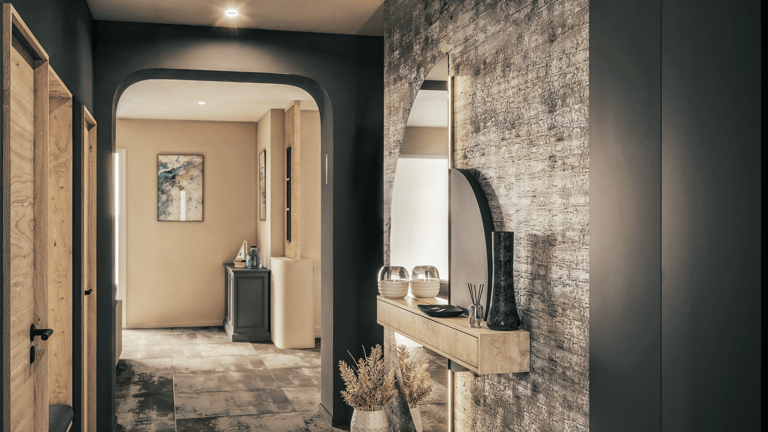 Les volumes ont été entièrement repensés pour offrir un confort contemporain, en s’appuyant sur des lignes directrices épurées, des courbes élégantes et des jeux subtils de matières et d’éclairage. Dès l’entrée, l’attention est captée par des rangements sur mesure intégrant une banquette accueillante et un miroir dessiné dans les moindres détails.