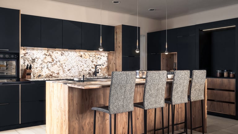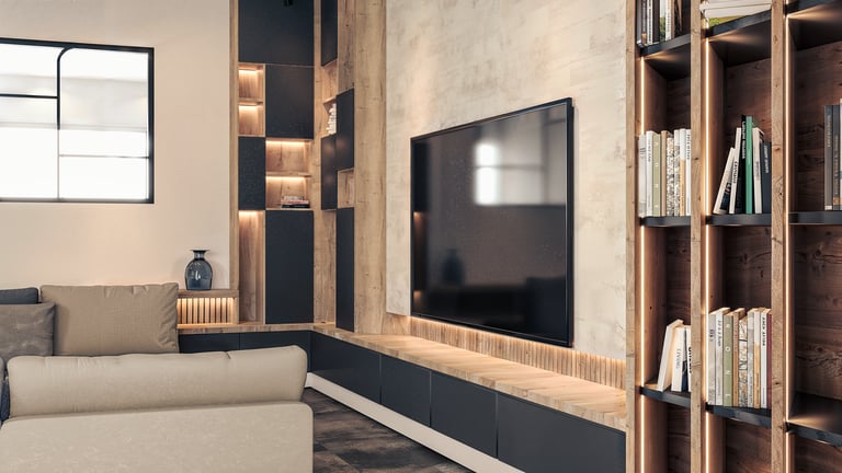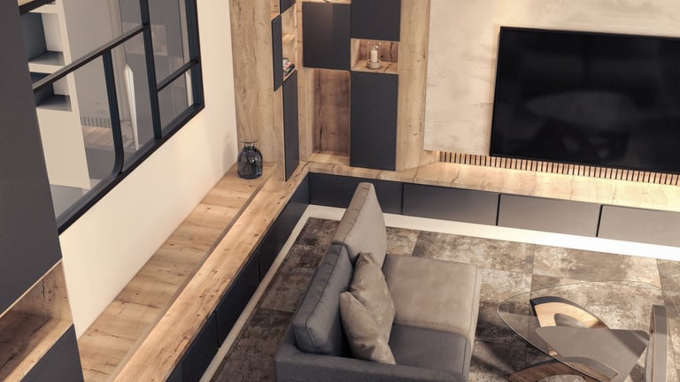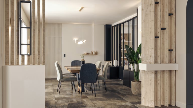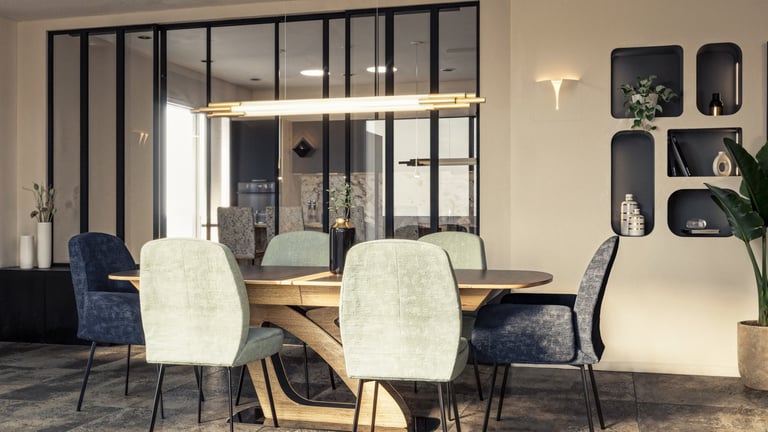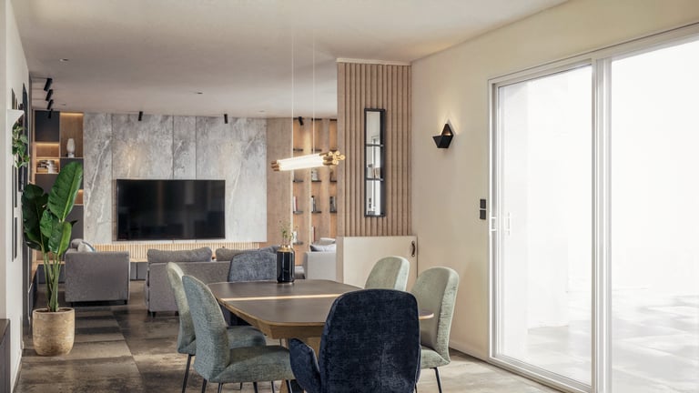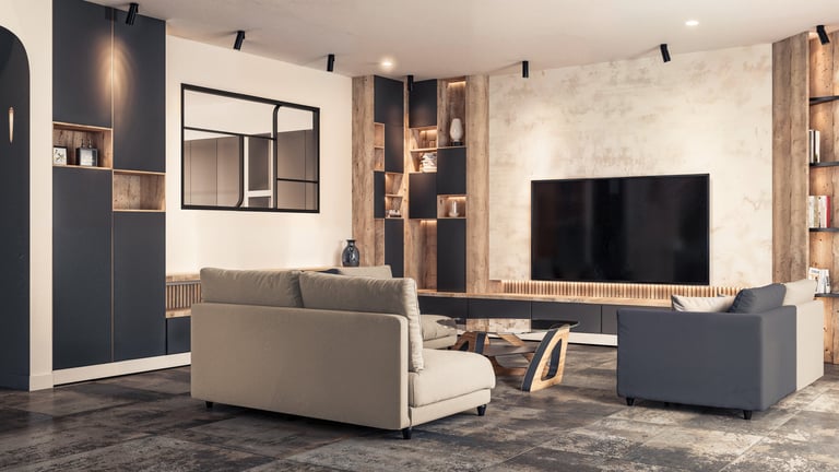 Le cœur de la maison se dévoile avec un vaste salon baigné de lumière, ouvert sur la salle à manger, où trône un impressionnant meuble TV sur mesure en chêne clair. À la fois fonctionnel et esthétique, ce dernier se distingue par ses nombreux rangements et son design moderne, véritable pièce maîtresse de cet intérieur sublimé.